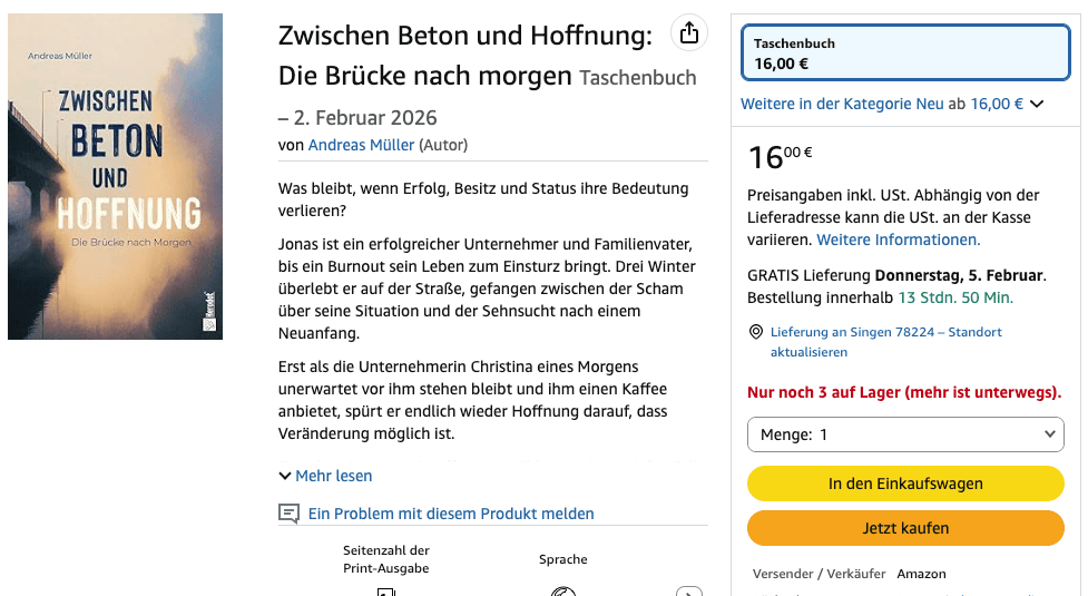 Wir rödeln seit Wochen im Pre-Launch des Buches, hatten am Samstag eine wundervolle Lesung mit über 30 Gästen und Besuchern in meiner Heimat-Gemeinde und heute ist der offizielle Tag, an dem es raus kommt. Dank der vielen Vorbestellungen ist es auf Amazon schon fast ausverkauft und hat nur noch 3 Exemplare, aber dank moderner Drucktechnik und der ganzen Digitalisierung passiert die Nachbestellung von ganz alleine.